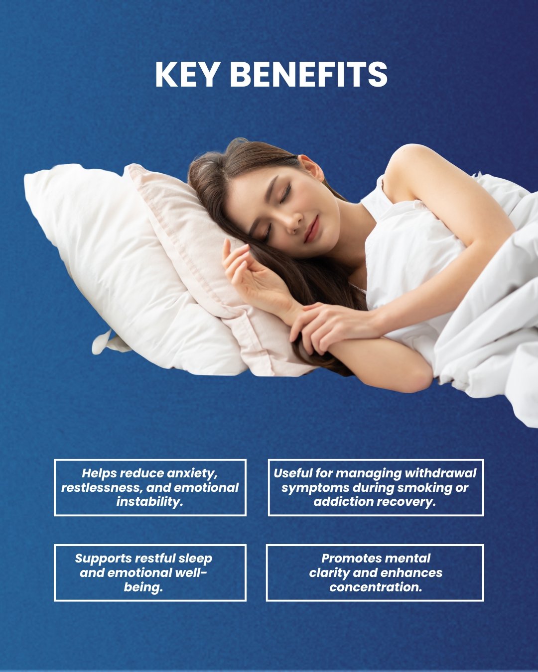 - Assists in managing stress-related conditions like anxiety and restlessness.