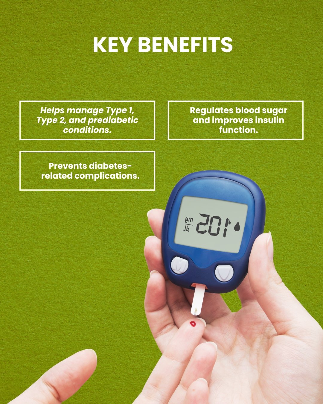 • Concurrently,it offers corrective and preventive benefits to overcome undesired consequences of diabetic conditions.