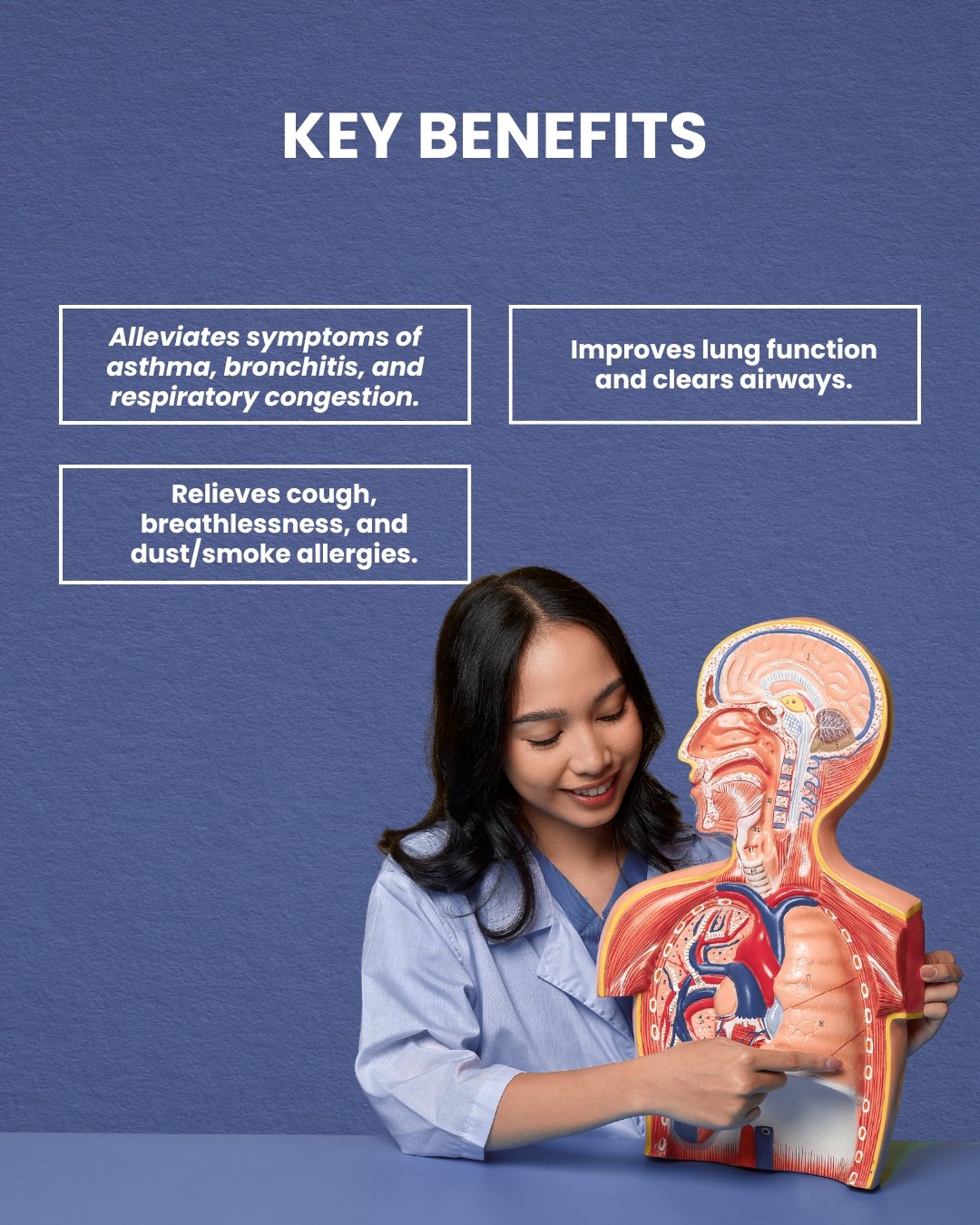 - Improves lung function. it relieves respiratory congestion due cold, dust and smoke allergy.